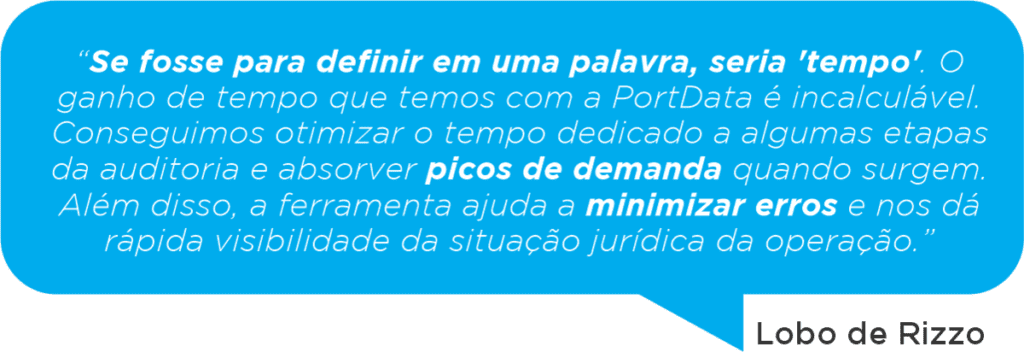 Se fosse para definir em uma palavra, seria ‘tempo’. O ganho de tempo que temos com a PortData é incalculável. Conseguimos otimizar o tempo dedicado a algumas etapas da auditoria e absorver picos de demanda quando surgem. Além disso, a ferramenta ajuda a minimizar erros e nos dá rápida visibilidade da situação jurídica da operação.